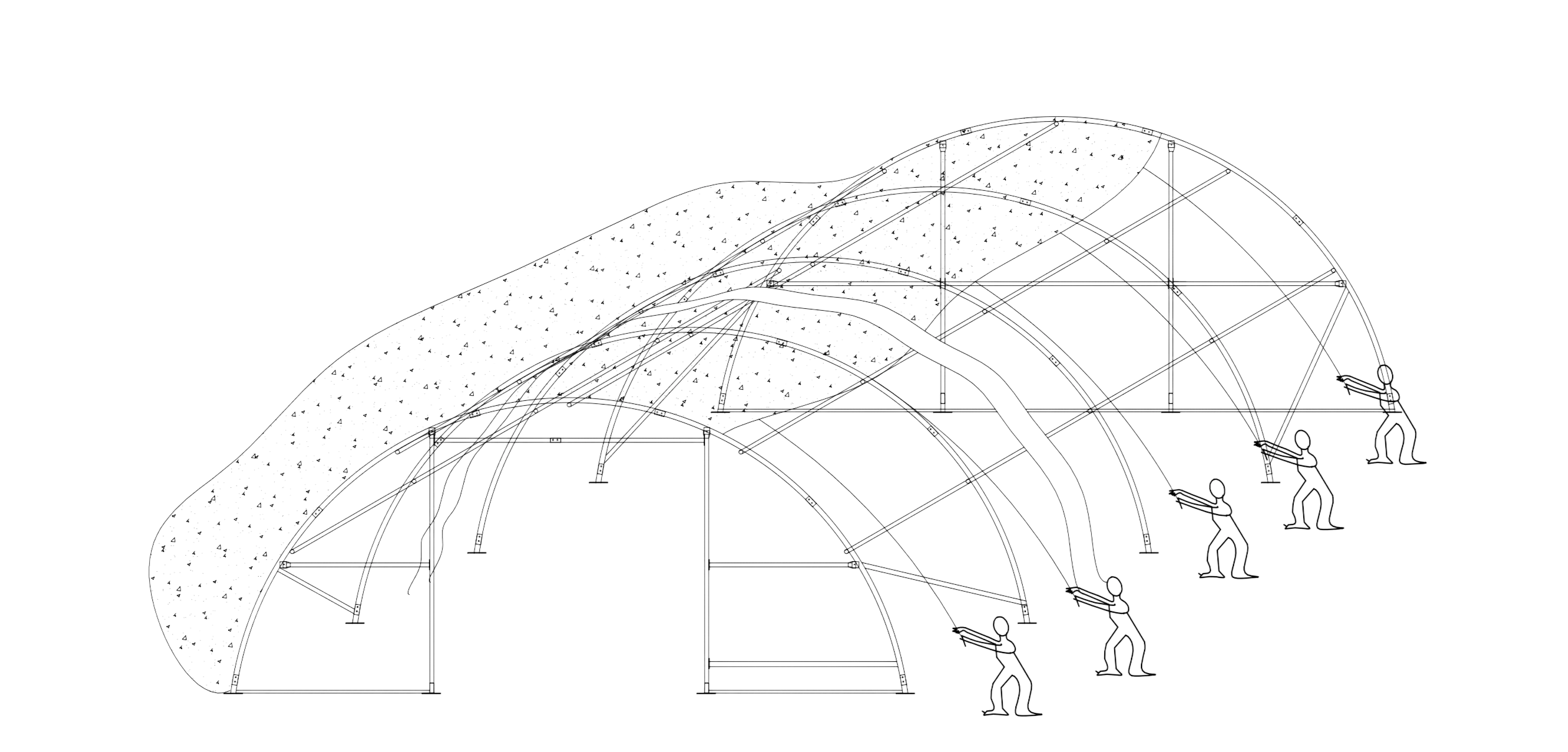 Het boogdak bestaat uit verticale bogen die worden versterkt door horizontaal lopende stalen buizen en stevig met elkaar verbonden zijn door middel van geschroefde verbindingen. Deze dakvorm voorkomt waterophoping en -opbouw, zelfs over langere periodes, omdat regen en vuil gelijkmatig kunnen weglopen.