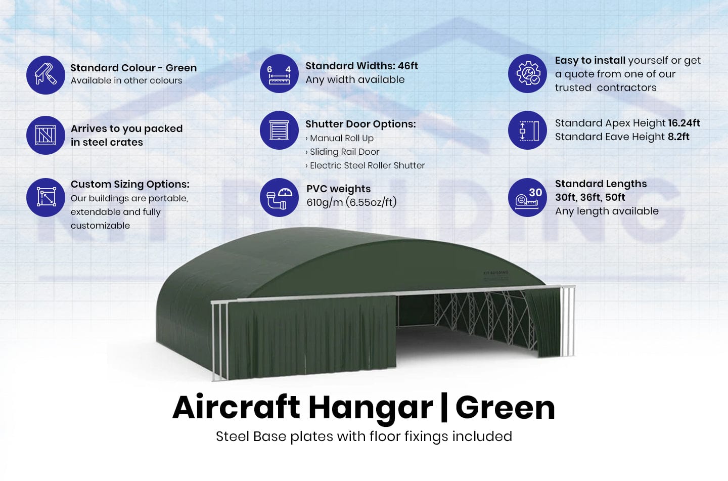 - Fabric Materials: We offer a 5-year product warranty on our PVC 23 oz/sy (610g/m²) external building fabrics, covering you against material defects. Kit Buildings